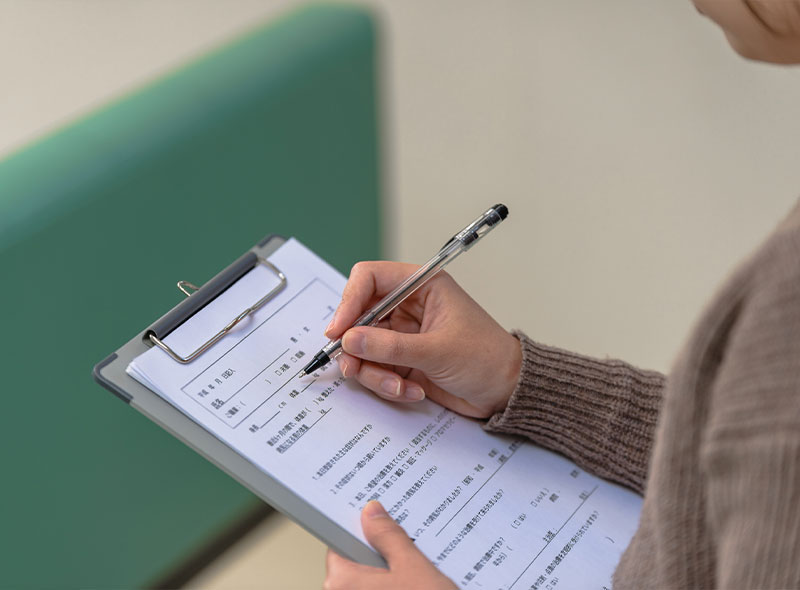 待合室にて、現在の体調や受診の目的について問診票へのご記入をお願いします。いつ頃からどのような症状があるのか、治療に対するご希望やアレルギーの有無などを詳しくお書きください。